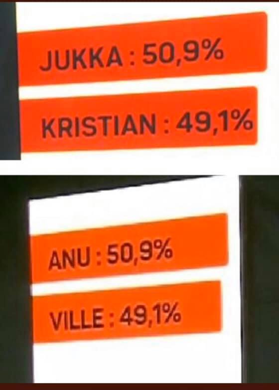 En mä sillä että Ville mun suosikki olis ollu, ihmisten rahnojen takia vaan ajattelen, että hukkaan menevät kun tulos on jo valmiiksi päätetty... joka kaudella sama homma