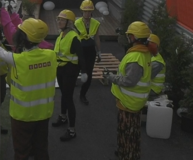 Tarina haikailee jo tulevia viikkotehtäviä, toivoisi fyysisiä tehtäviäkin vaikka ei ole lainkaan varma olisiko sitten innoissaan itse tehtävässä. Ihastelevat Millan kanssa raksavaatteitaan.